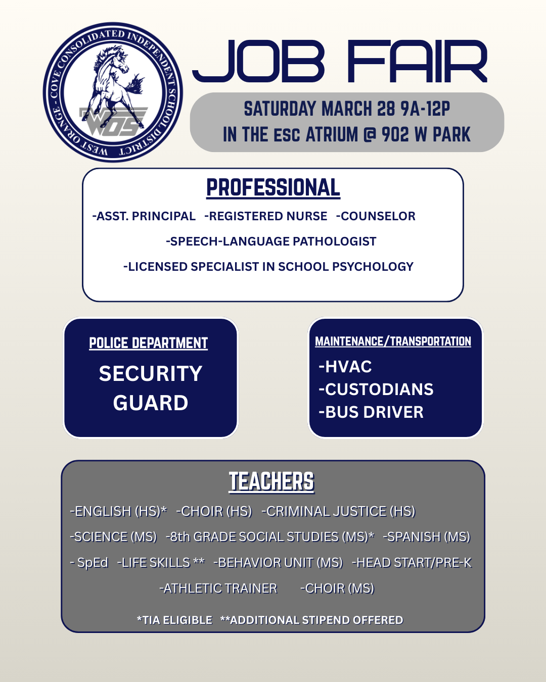 Are you ready to join the Mustang family? Discover a new career at the West Orange-Cove CISD Job Fair! Register using the link below: