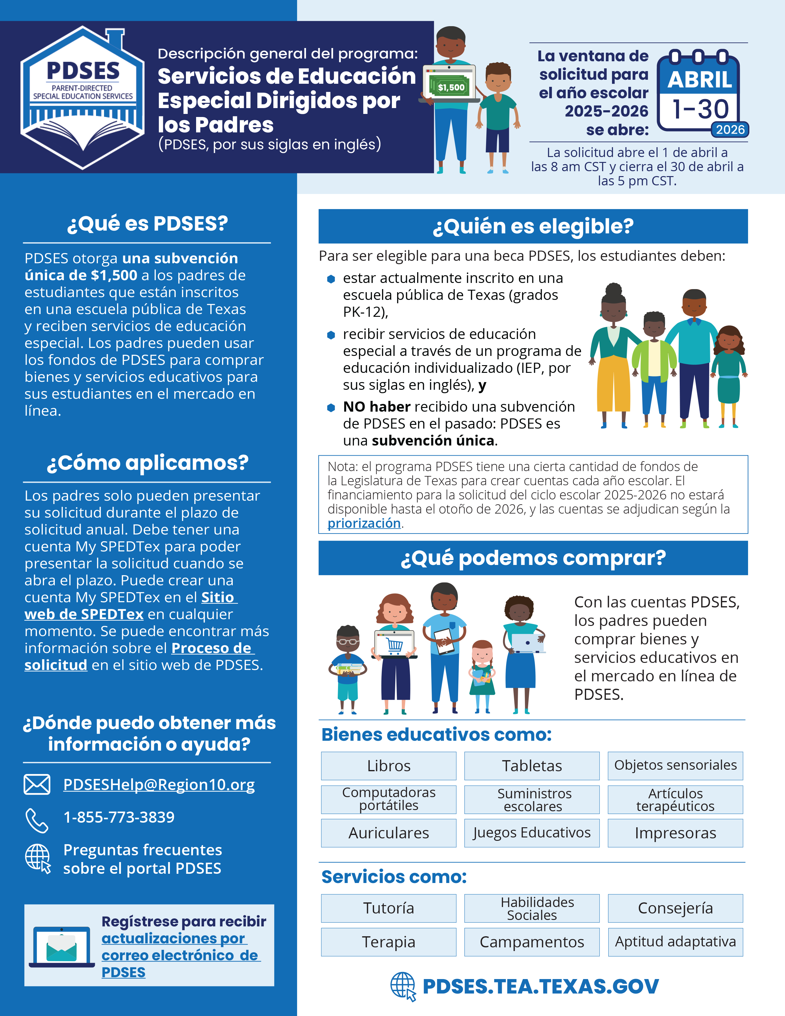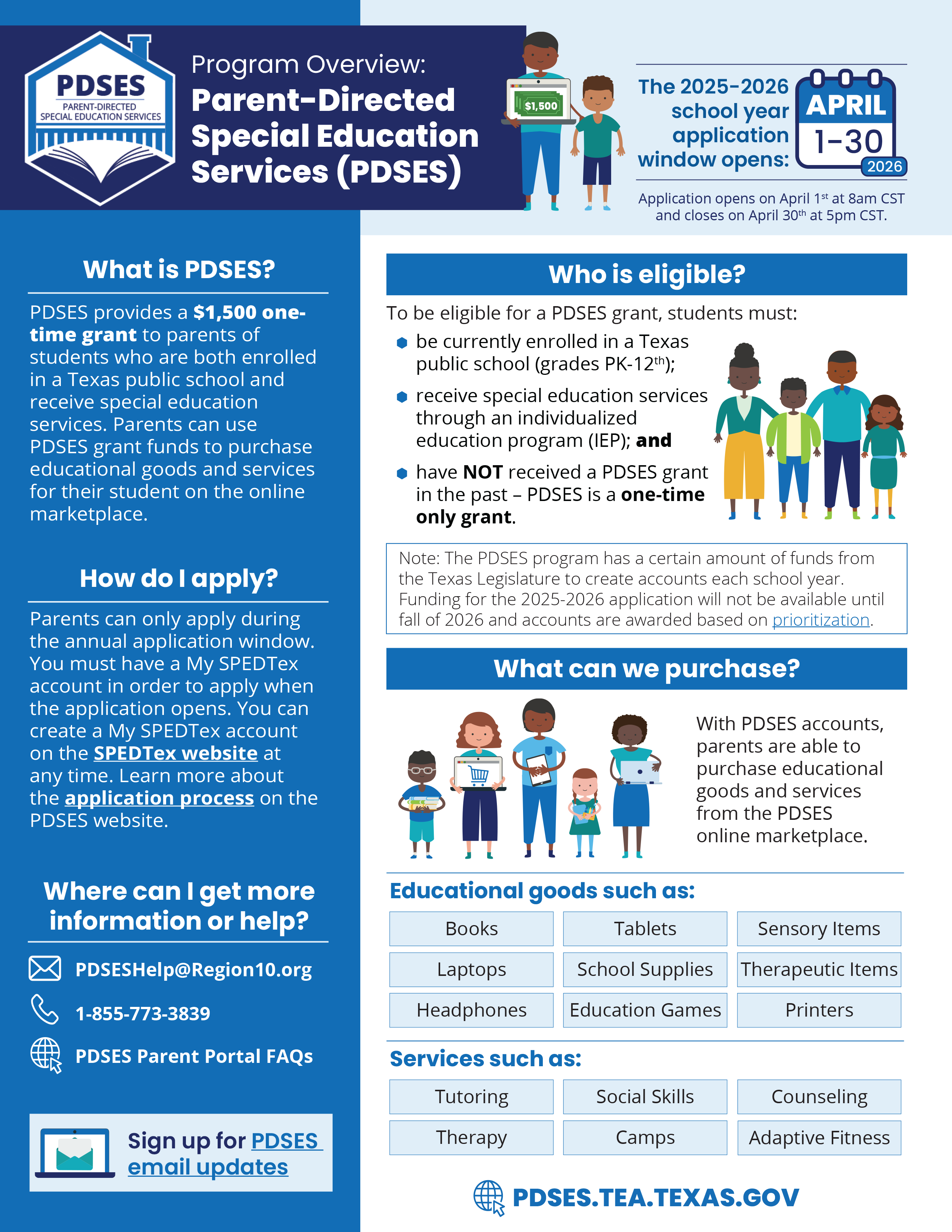 Attention parents! Applications for the Parent-Directed Special Education Services grant are now available! Eligible families can receive $1,500 in funds to purchase a variety of educational supplies. To learn more, visit tea.texas.gov.